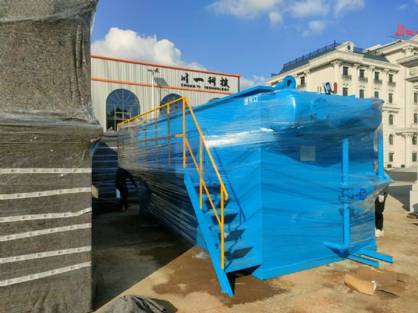 溶氣氣浮機采用新型的溶氣設備——微氣泡發生器,代替傳統的引氣設備向水中溶氣,并在氣浮區域內安裝若干斜管組,包括箱體、刮渣機、螺旋出料機共同組成一個完整氣浮凈水裝置。當懸浮物的密度大于1時,由于安裝了斜管組,就會產生淺池沉淀的效果,從而使沉淀在紊流條件下進行。粒徑教大、比重教大的不易上浮的污染物質就會集中到集泥區里,達到凈水的目的。